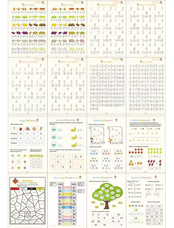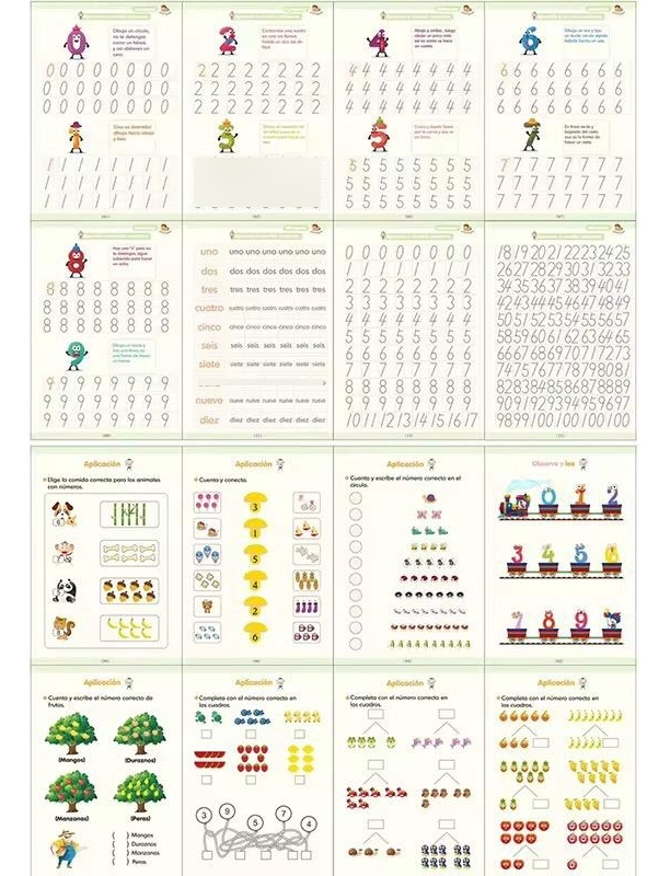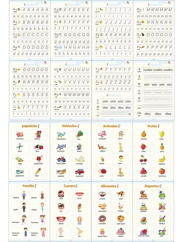 Incluye 4 libros diseñados para enseñar el alfabeto, los números, matemáticas, y habilidades de dibujo. Cada libro tiene relieves que ayudan a los niños a seguir las siluetas, mejorando su escritura y precisión.