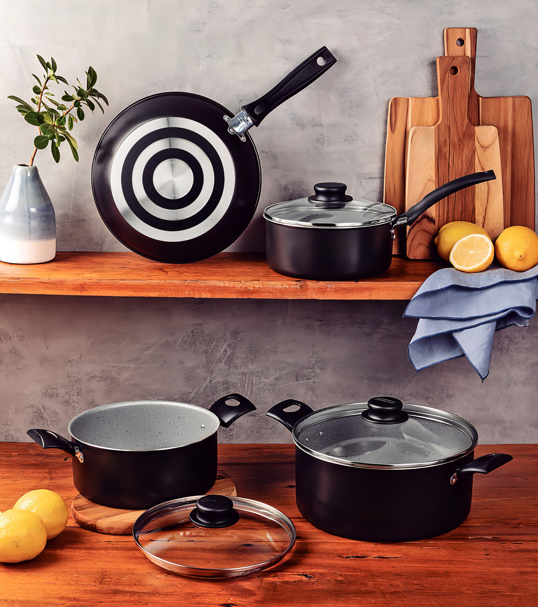La batería de cocina está compuesta por piezas con cuerpo de Aluminio con un espesor que brinda una cocción rápida y uniforme. Cuentan con un revestimiento interno y externo de anti-adherente Starflon Max, que no deja que se peguen los alimentos y es fácil de limpiar, más durable y no perjudicial para la salud, ya que está libre de PFOA. Sus tapas son de vidrio templado con bordes de acero inoxidable y sus mangos son asas de baquelita anti-térmica y agarradores de nylon que proporcionan seguridad durante la manipulación.