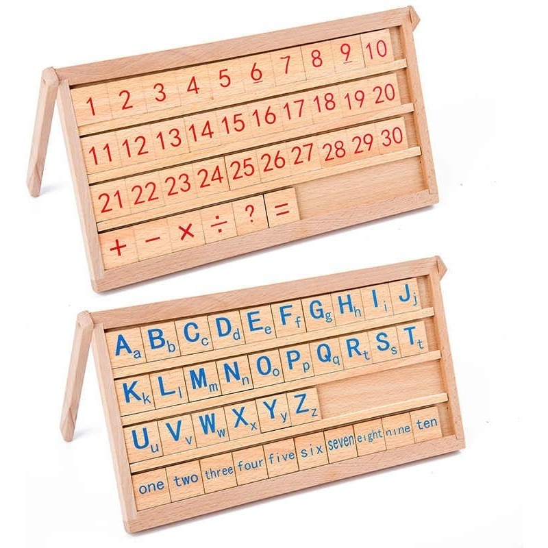 35 piezas de madera de 2,5 cm x 2,5 cm con números, letras y palabras en ingles en ambos lados.