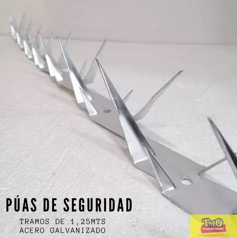 Se pueden instalar tanto en muro, pared, rejas, techo, madera. Se presentan en tramos de 1,25 m, con dos hileras de púas, que se intercalan.Los pinchos están plegados a modo de nervio, que los hace mas resistentes. Cada tramo de 1.25 mt de largo10 perforaciones para tornillos pronta para colocarEspesor de la placa: 2.0 mmAltura…