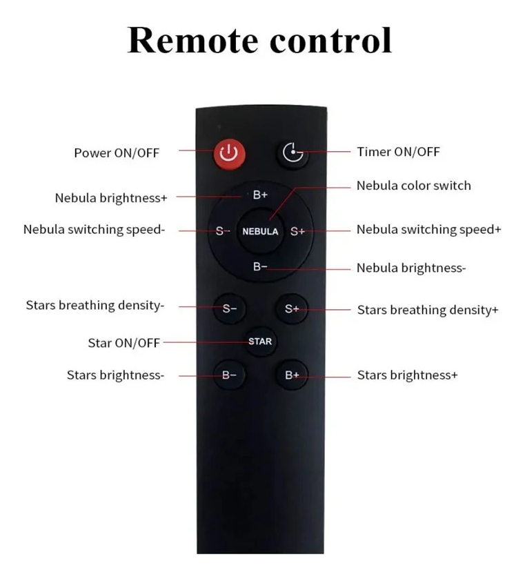 Este proyector ofrece dos métodos de control: botones en la parte posterior y un mando a distancia. Mientras que los botones posteriores controlan el encendido, el cambio de modo nebulosa y cielo estrellado, y el apagado prolongado, el mando a distancia permite ajustar el color, el brillo y la frecuencia de parpadeo de las nebulosas y el cielo estrellado, así como cambiar los ajustes de temporizador.