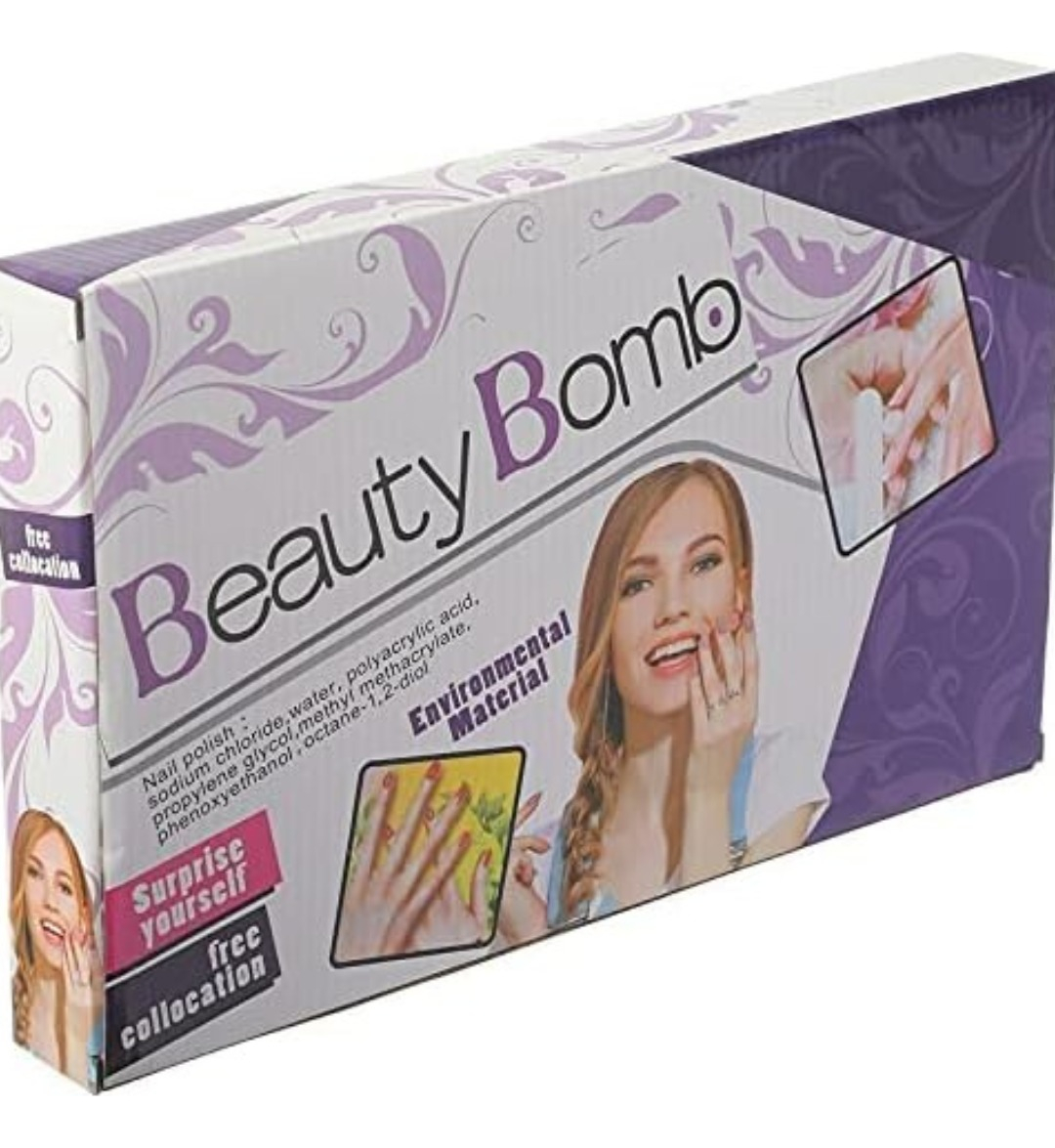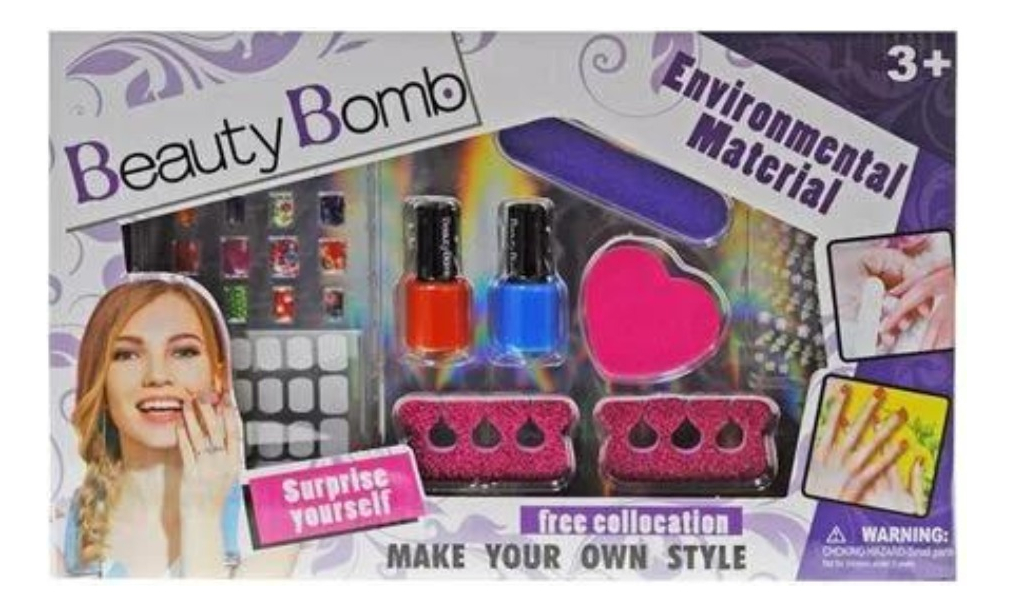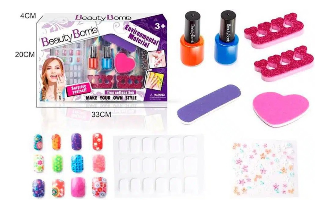 Con esmaltes, separadores de dedos, limas y juegos de uñas postizas.